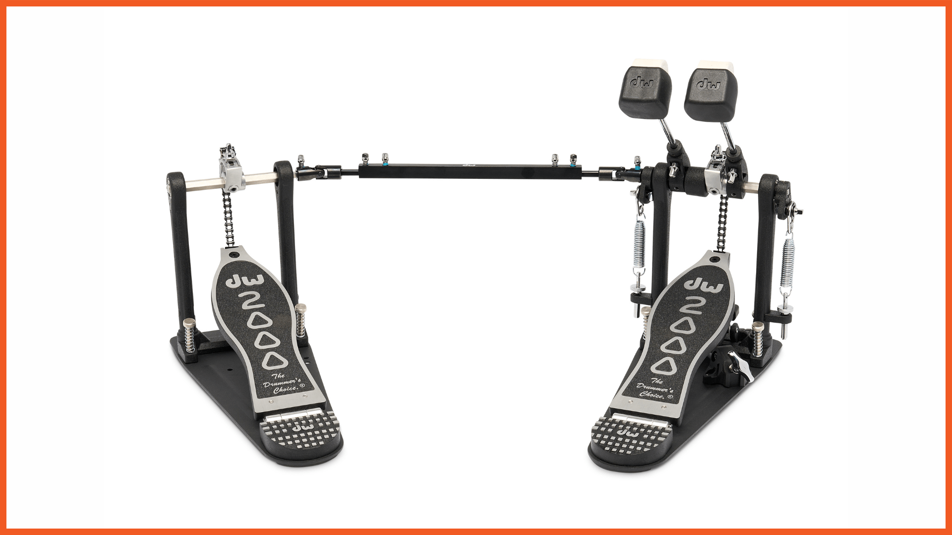 The double pedal has a drive shaft with DW’s telescoping universal joint with memory locks for smooth, reliable playing.