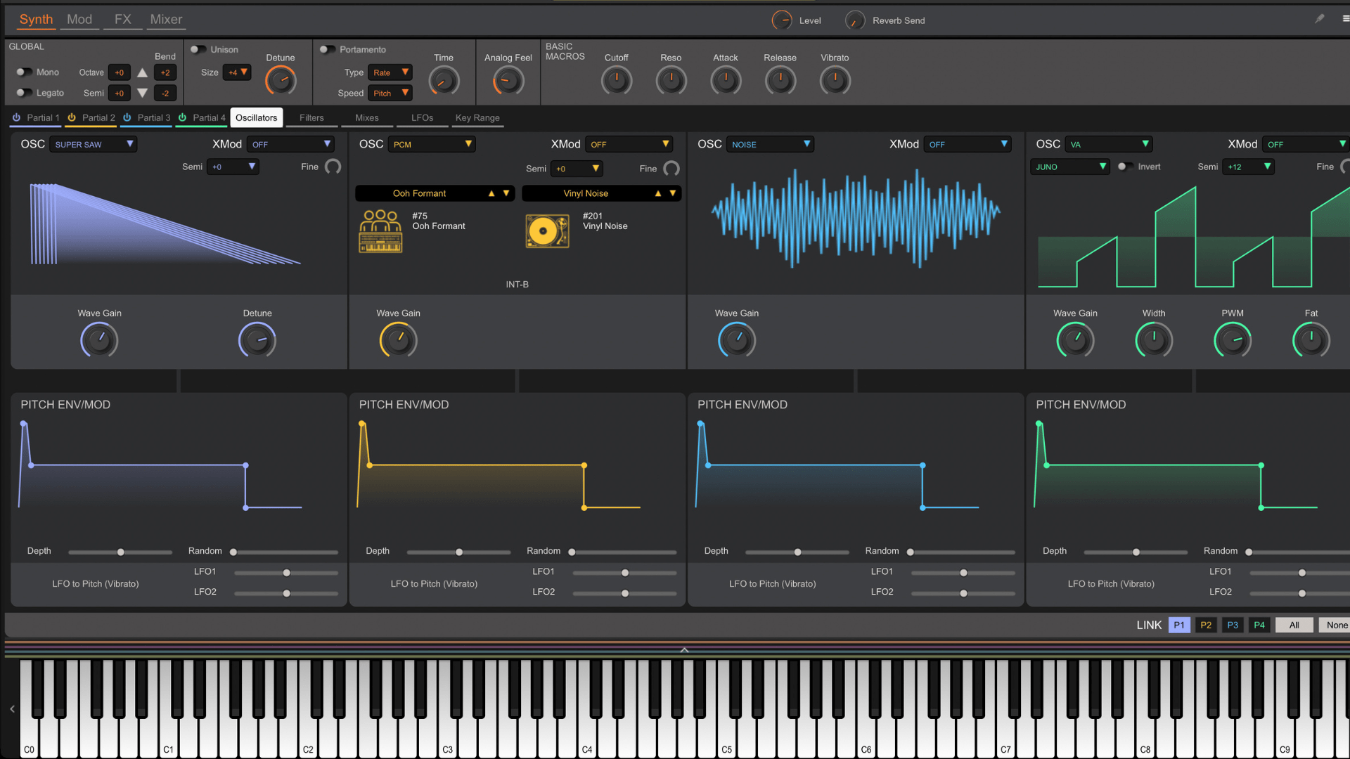 - Nine virtual analog waveforms, plus Supersaw, Noise, PCM, and PCM Sync