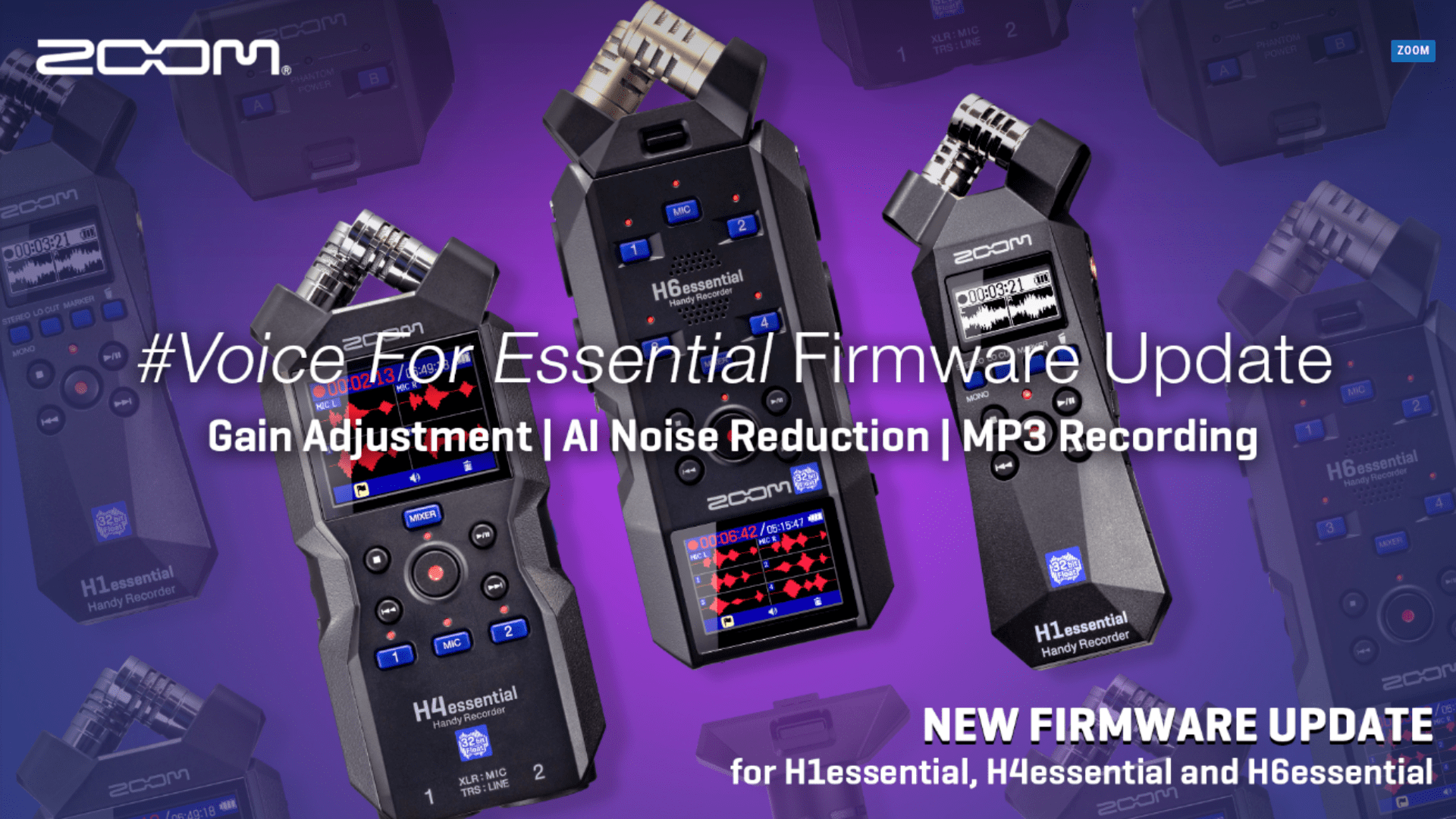 Zoom is pleased to announce new Firmware Updates for the H1essential, H4essential and H6essential Handy Recorders.