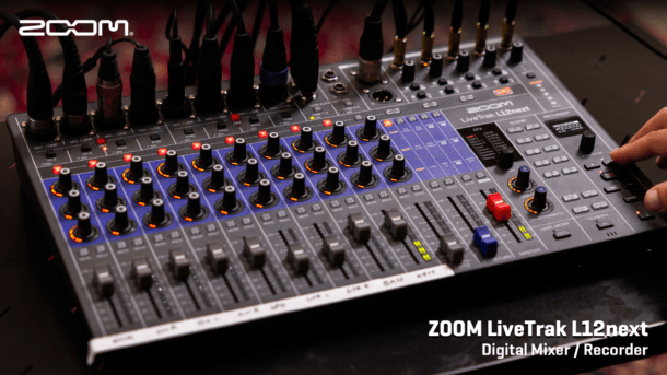 Zoom is pleased to announce the LiveTrak L12next 12-channel digital mixer / 14-track multitrack recorder. The L12next combines the power of a digital mixer with analog-style operation. With its new OLED screen, upgraded ultra low noise preamps, three multifunction encoder knobs per channel for easy access to gain, compression, lowcut, High/Mid/Low EQ, pan, sends, and a talkback mic, the L12next puts you in total control.