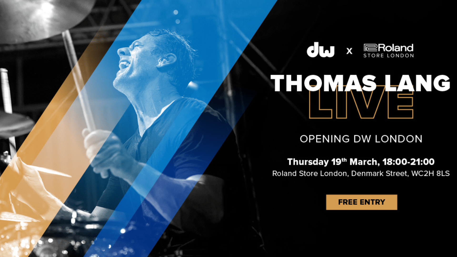 Thomas Lang Live: Opening DW London on Thursday 19th March 2026 at 18:00 at the Roland Store, Denmark Street, London, WC2H 8LS. Entry is FREE, grab your tickets now by registering here.